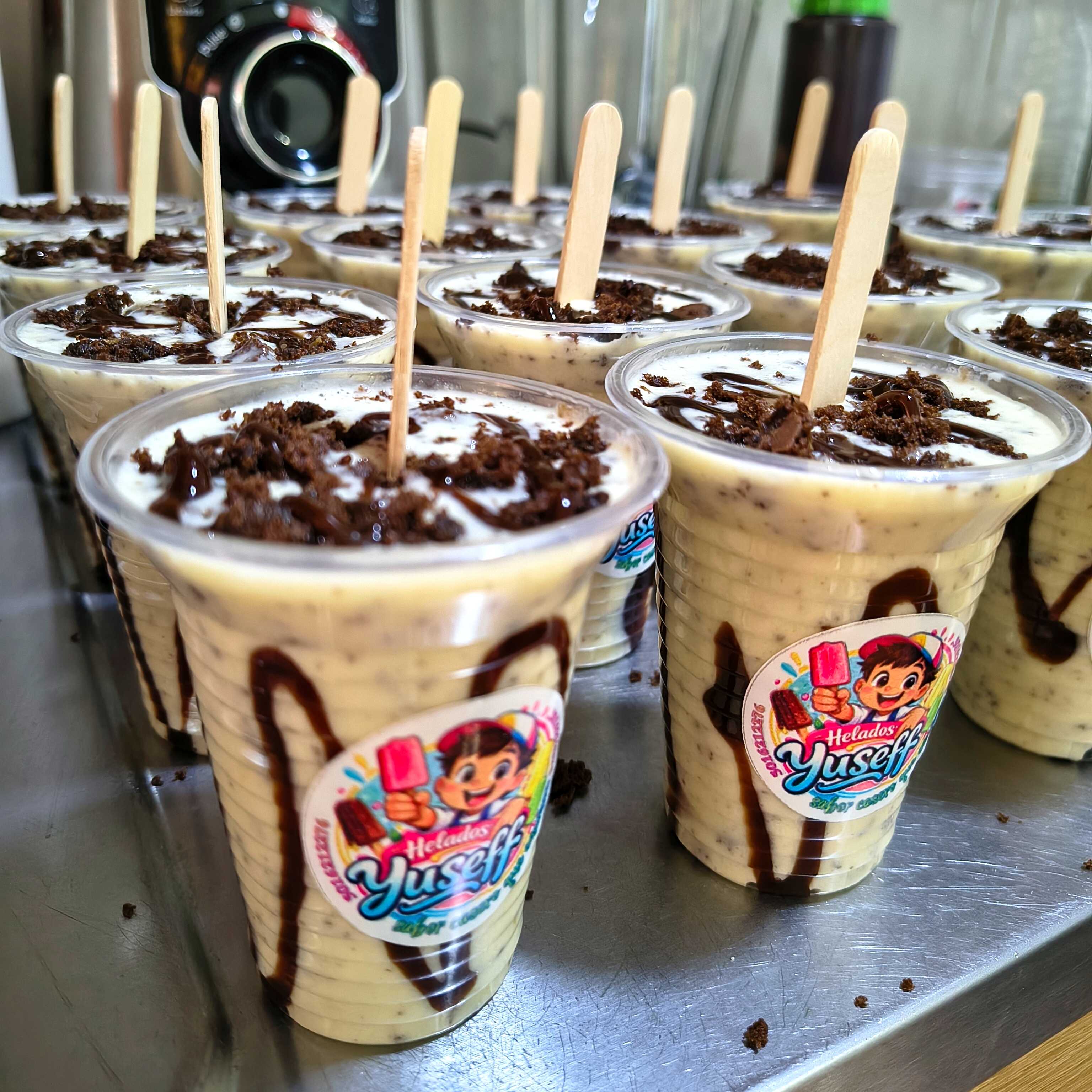 Deliciosa crema casera con trozos de brownie en su interior y con una cobertura de salsa de chocolate.