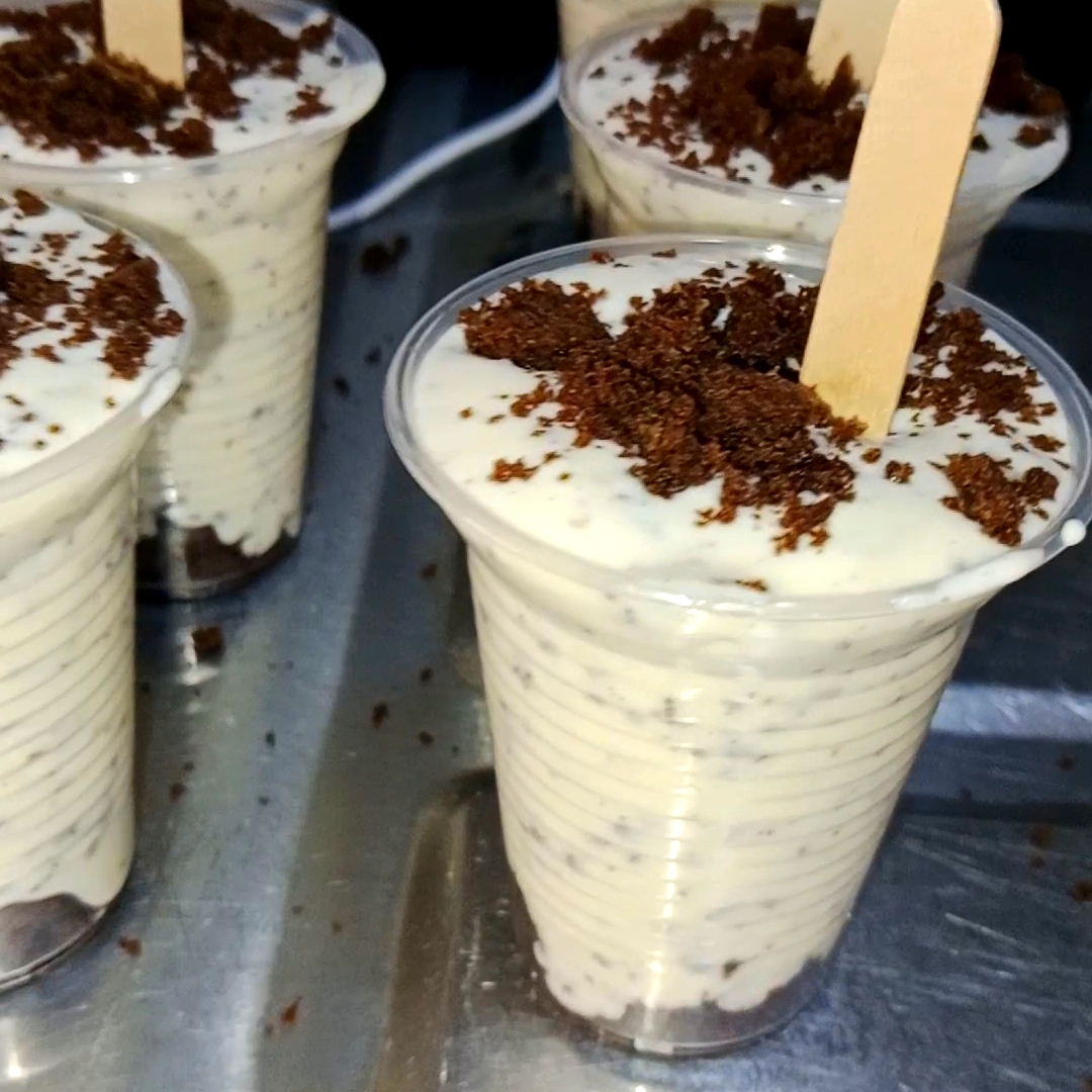 Deliciosa crema casera con trozos de galleta Minichips en su interior y una cobertura con salsa de chocolate.