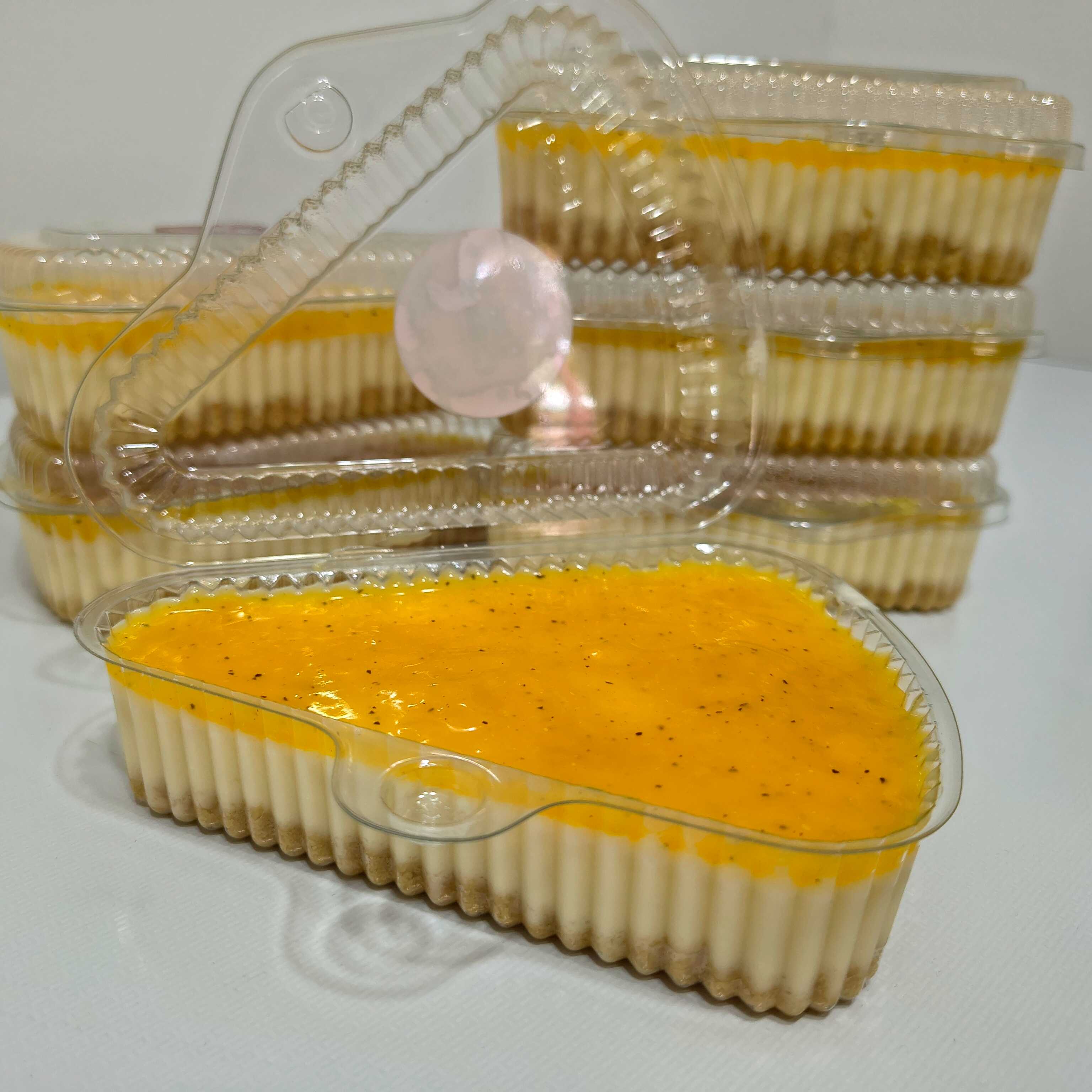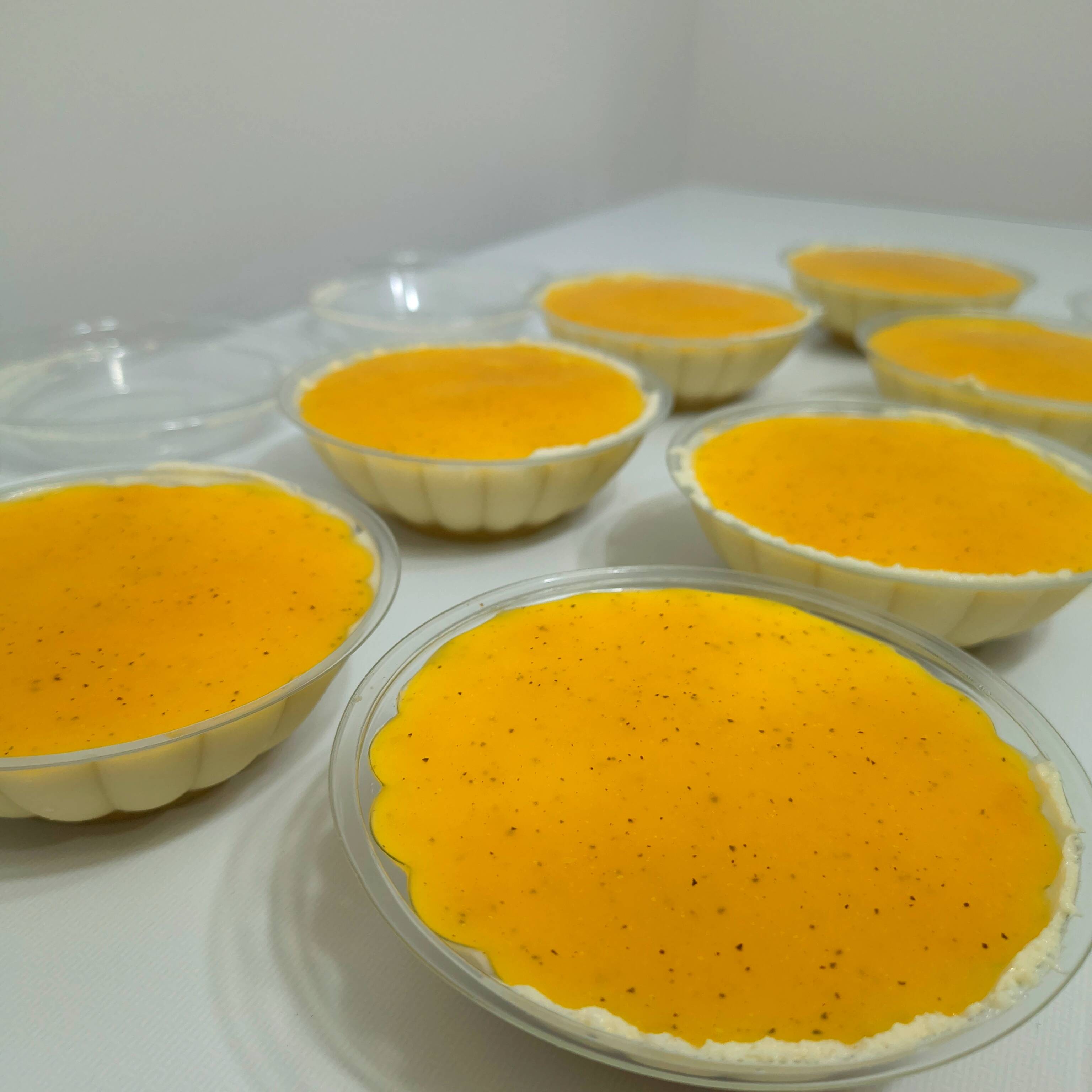 Delicioso postre personal con una base de galleta triturada más mantequilla, seguida de una mezcla de queso crema, leche condensada,crema de leche, vainilla y en la superficie un delicioso dulce de maracuyá.