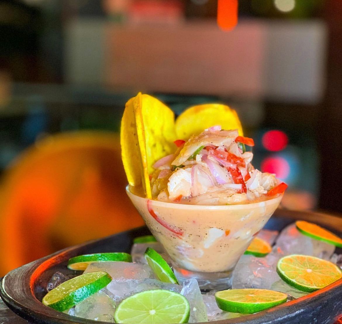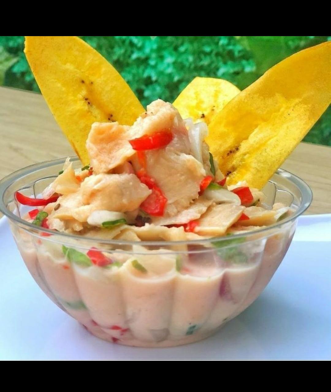 Ceviche de tilapia en leche de tigra y vegetales, acompañado de plátano chips.