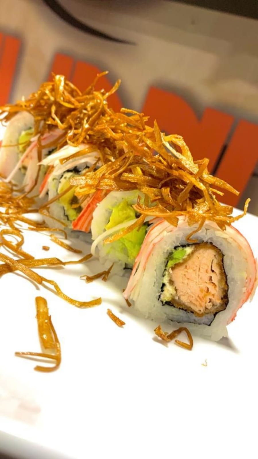 10 piezas salmón crispy, queso crema, aguacate y cubierto en cangrejo fresco.