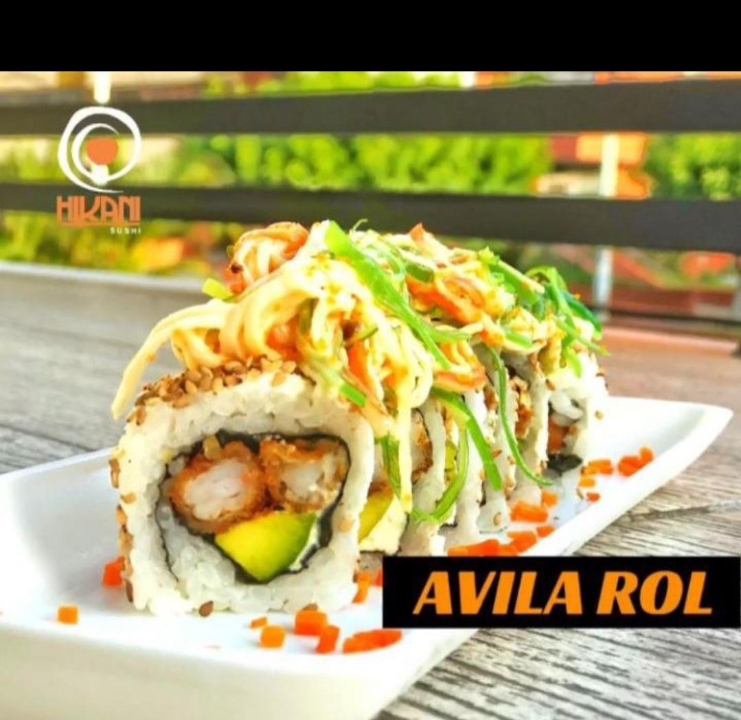 10 piezas camarón crispy, aguacate, queso crema, tope de camarones apanados en salsa dragón ligera picante.