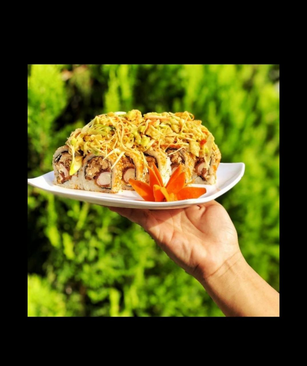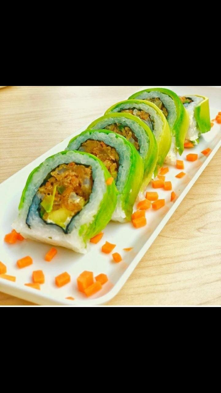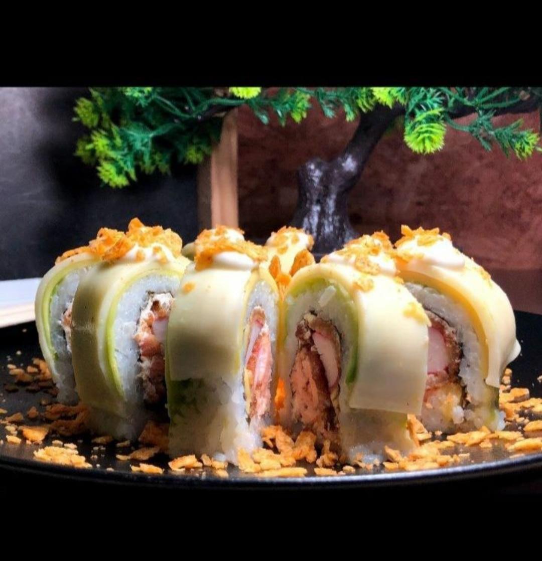 10 piezas atún crunch, queso crema, aguacate, cebollín bañado en salsa dragón.
