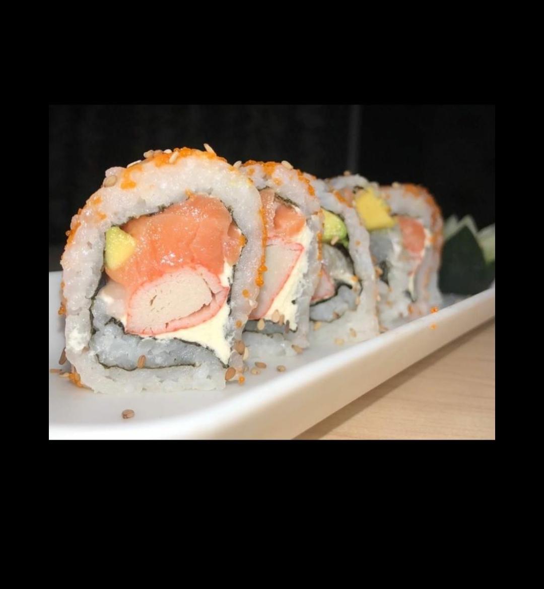 10 piezas de Roll de salmón fresco, palmito de cangrejo, tilapia, queso crema y aguacate, con tope de masago.