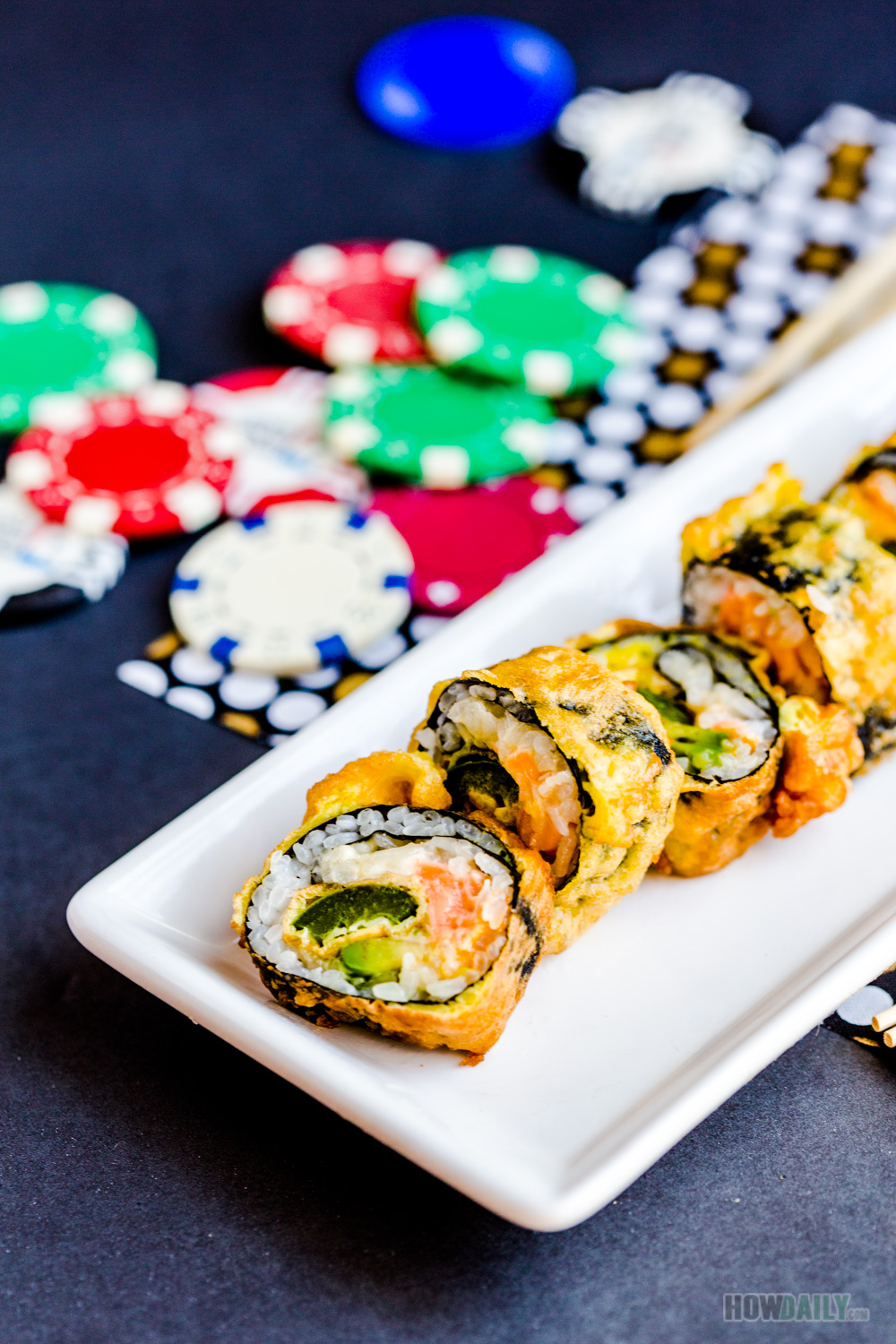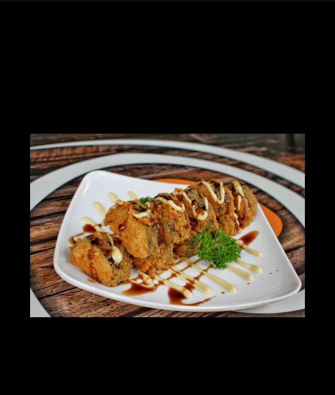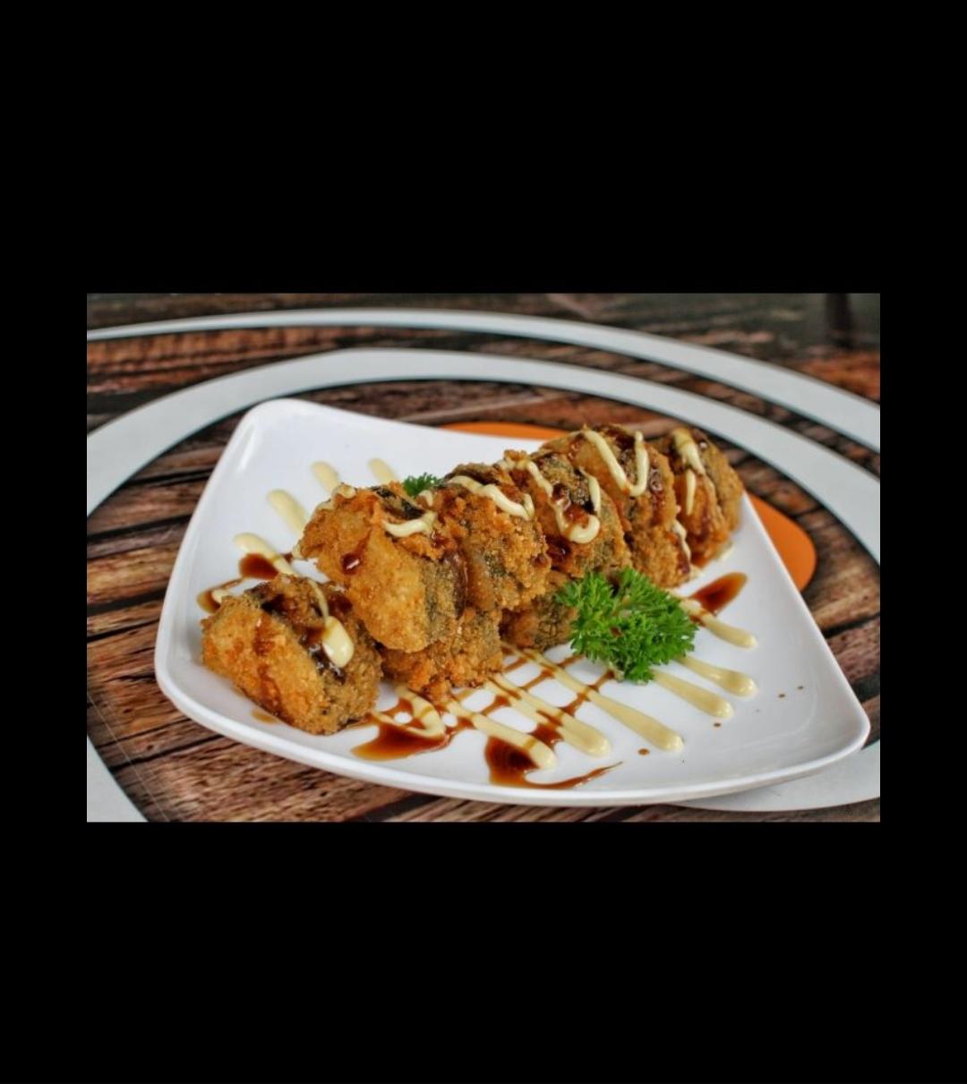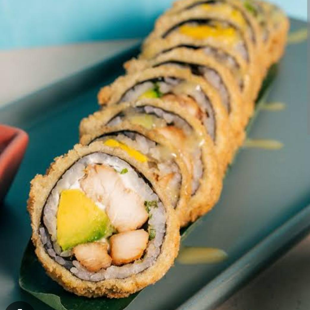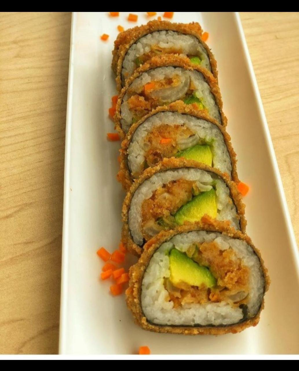 10 piezas relleno de vegetales tempura, queso crema, aguacate, tope de ajonjolí, opcional tope de aguacate o plátano y opcional sin queso.