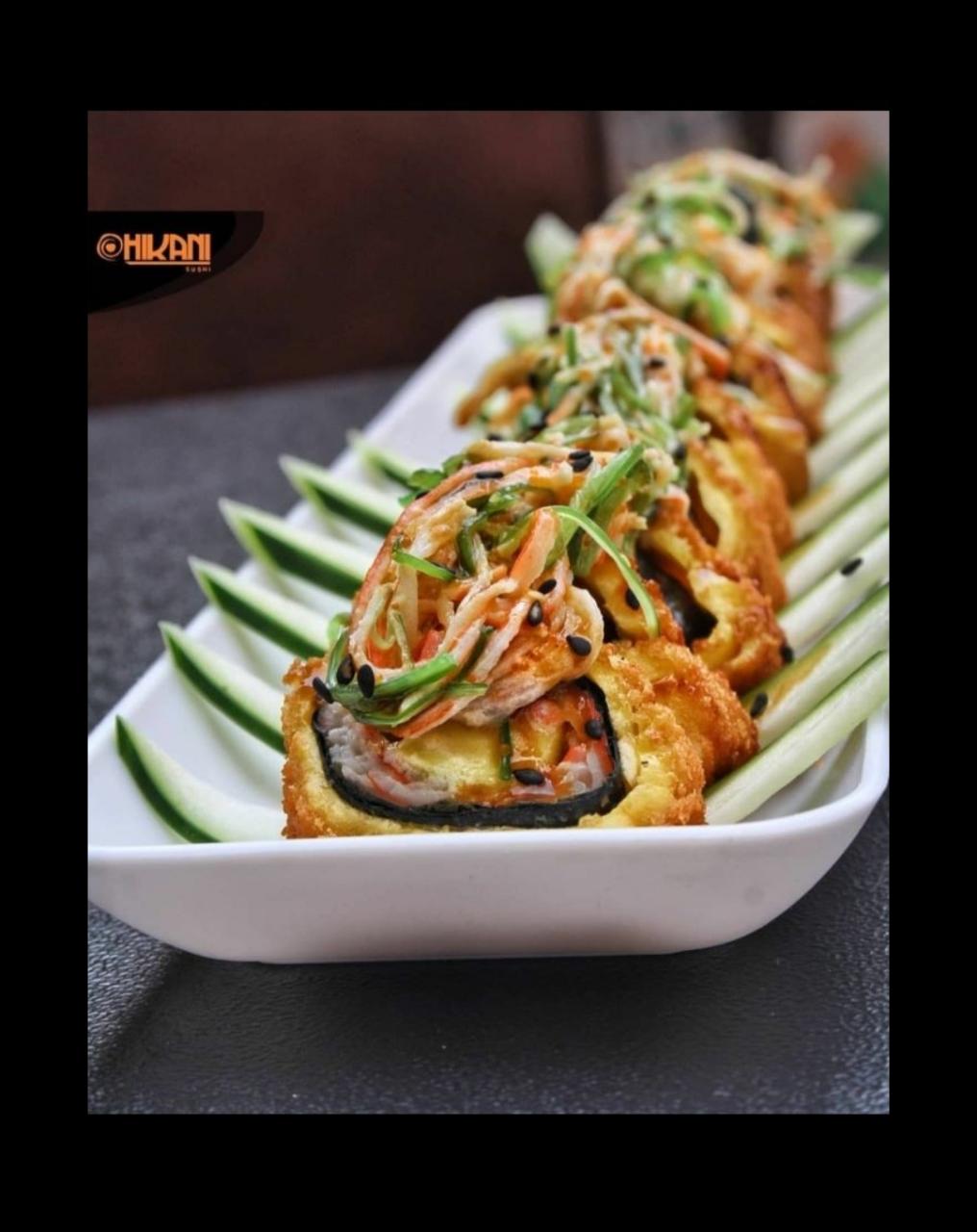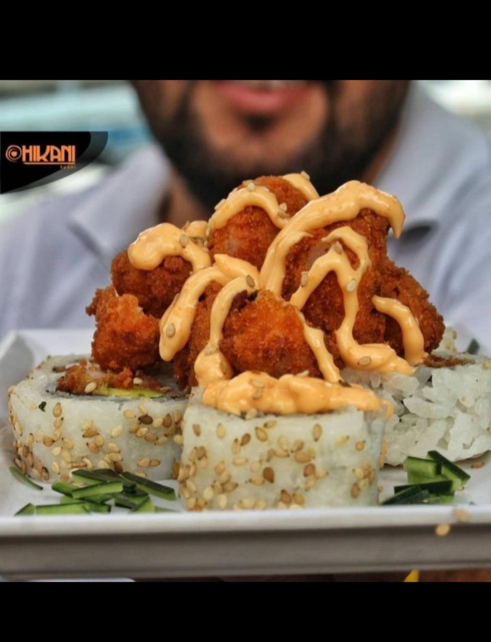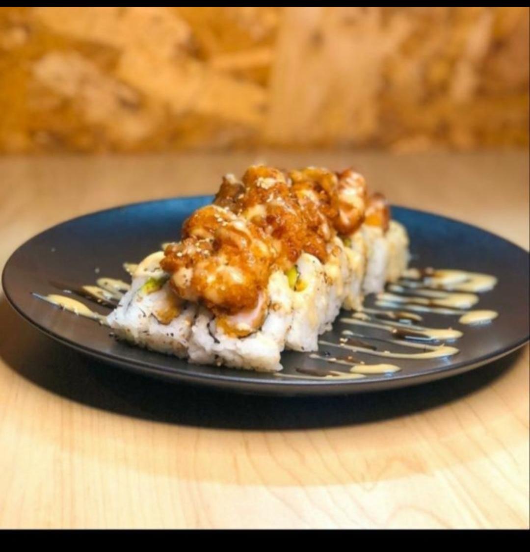 10 piezas camarón crunch, queso crema, aguacate, cada bocado tempura, bañado en salsa fují.