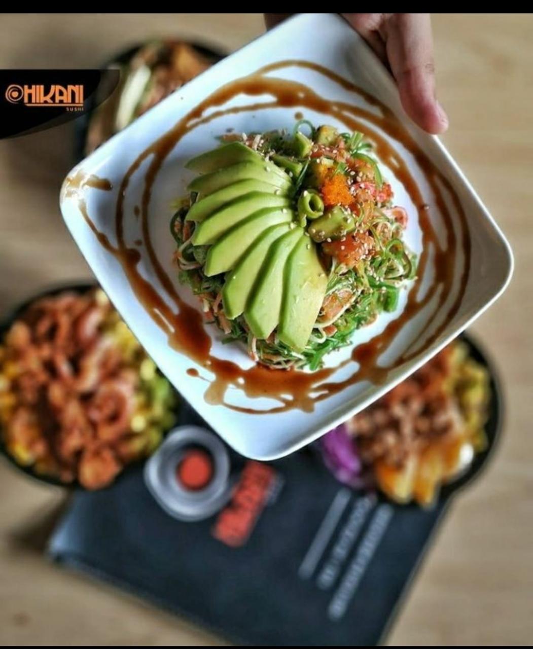 Finos cortes de palmito, wakame, salmón, masago, aguacate en salsa de la casa ligera picante.