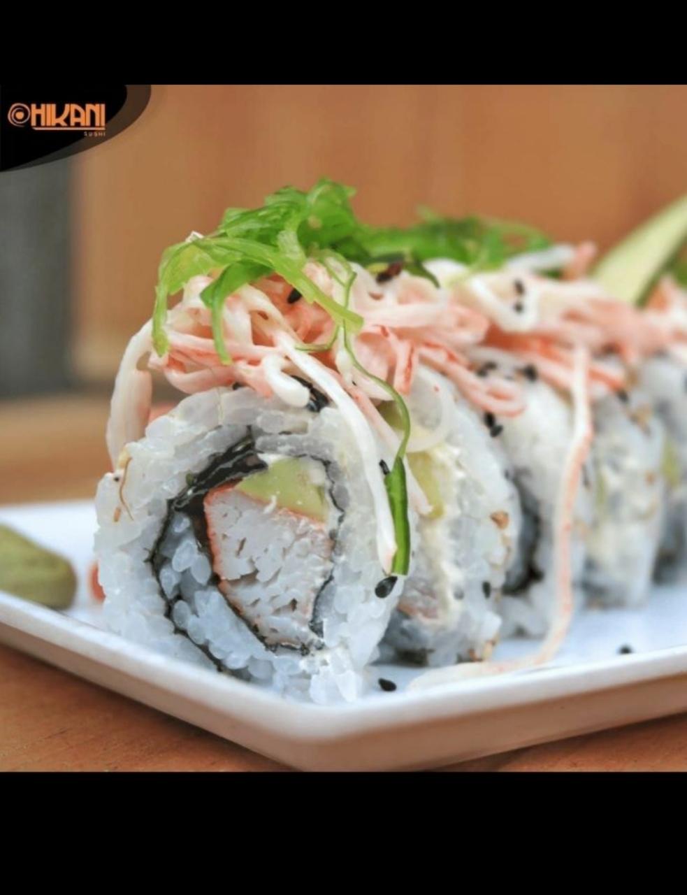 10 piezas relleno de palmito de cangrejo, aguacate, queso crema, pepino y tope de ensalada dinamita no es picante.