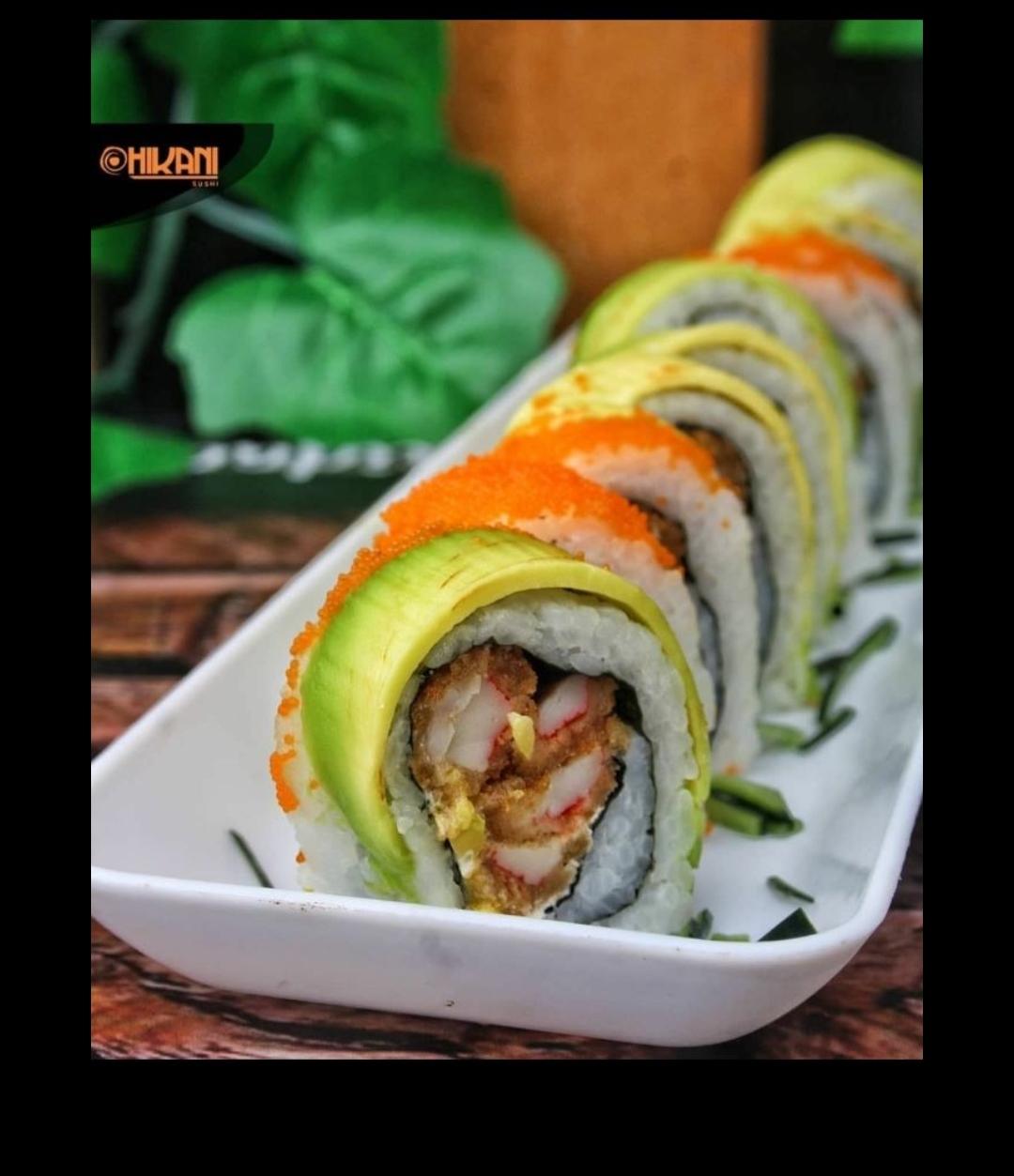 10 piezas de roll de cangrejo y salmón crunch, queso crema, aguacate, con tope de aguacate, queso mozarela y coronado con tortillas crunch.
