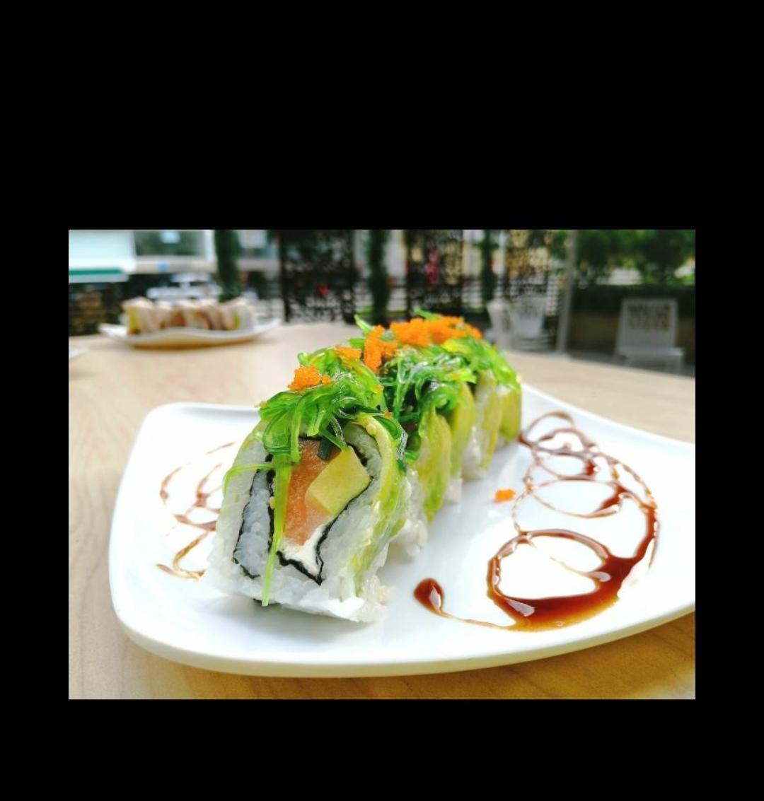 Roll 10 piezas sin arroz, palmito, queso crema, aguacate, envuelto en plátano, tope de ensalada dinamita y salsa teriyaki.