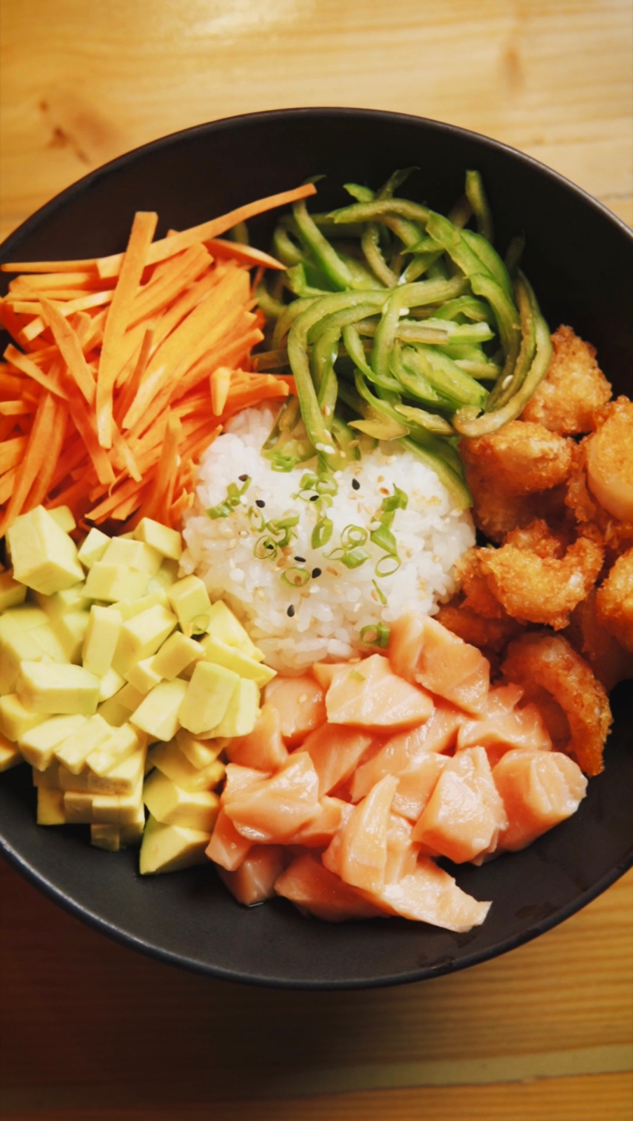 10 piezas camarón crunch, queso crema y aguacate, con tope de exquisita ensalada dinamita, no es picante.