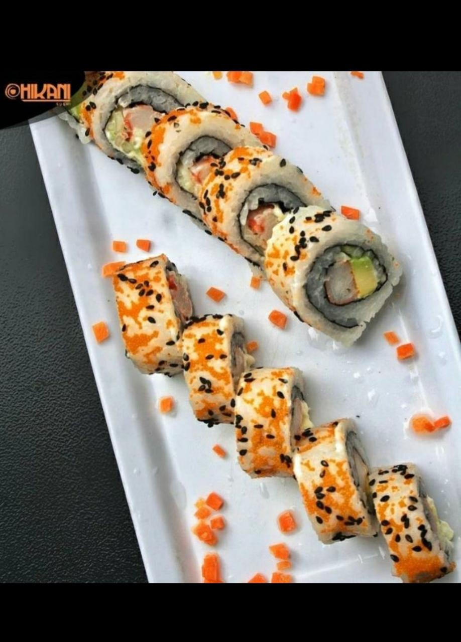 10 piezas relleno de camarón crunch, palmito crunch y queso crema, con tope de masago y aguacate.