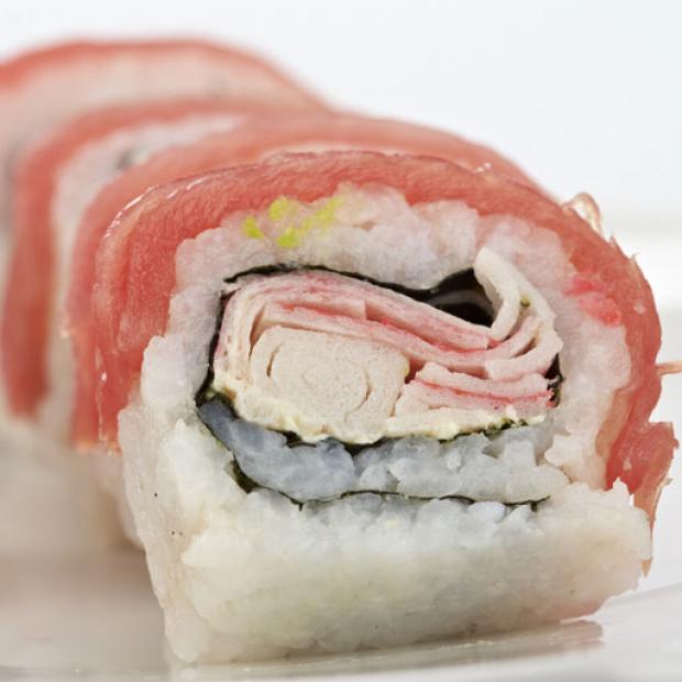 10 piezas atún, aguacate, queso crema, tope de tartar de atún picante.