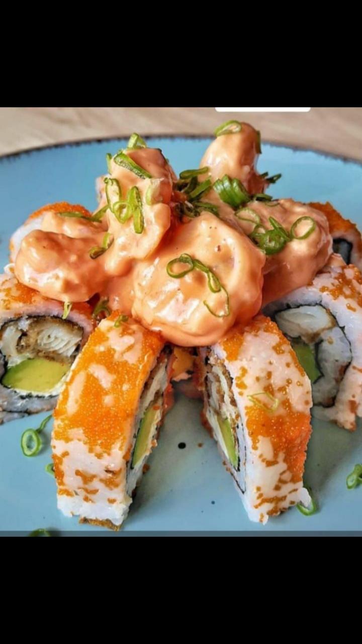 10 piezas relleno de pescado blanco crunch, queso crema y aguacate, arroz forrado en masago y delicioso toppíng de coctel de camarones en salsa.