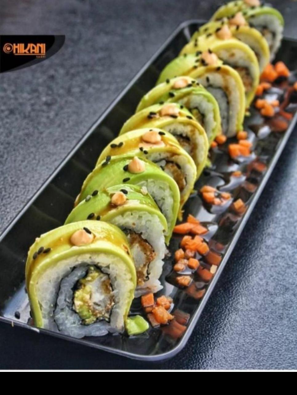 10 piezas pescado blanco crunch, aguacate, queso crema, tope de aguacate, acompañado de salsa dragón ligeramente picante y teriyaki.