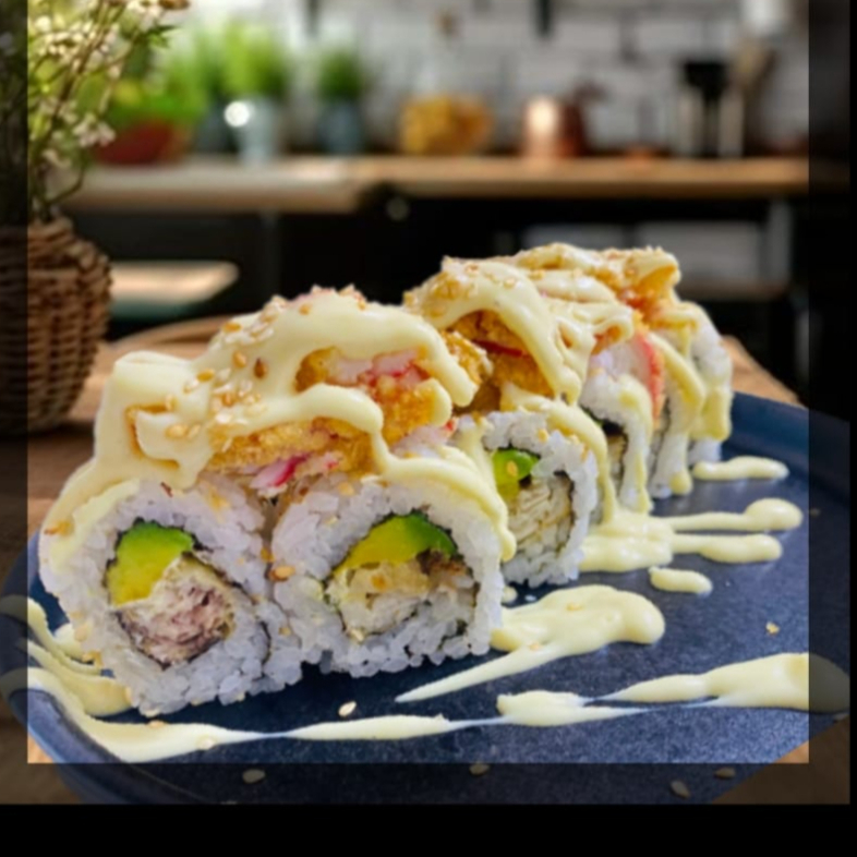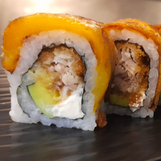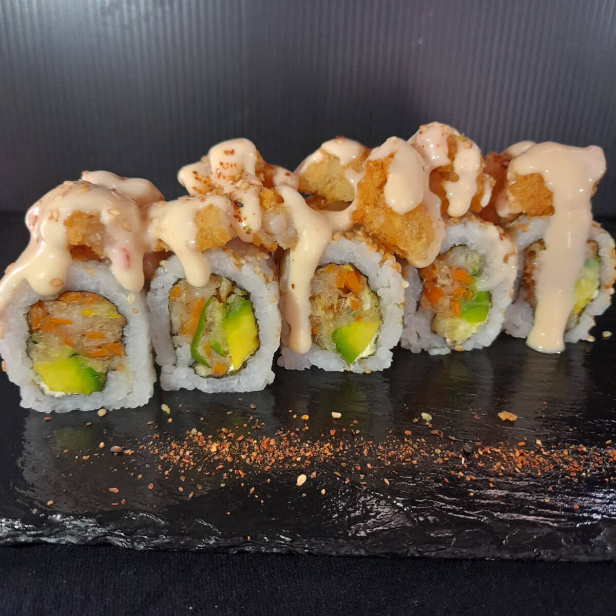 Contiene langostinos tempura, kanikama de queso crema, cubierta de aguacate y salsa spicy.