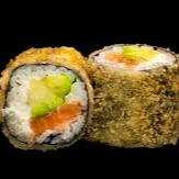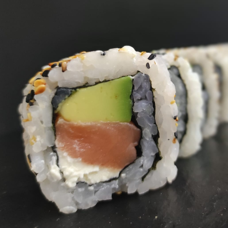 Salmón fresco, queso crema y aguacate cubierto de ajonjolí.