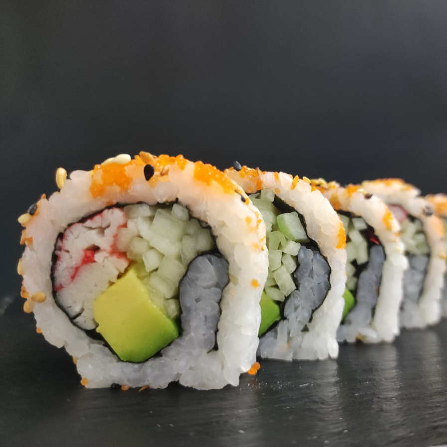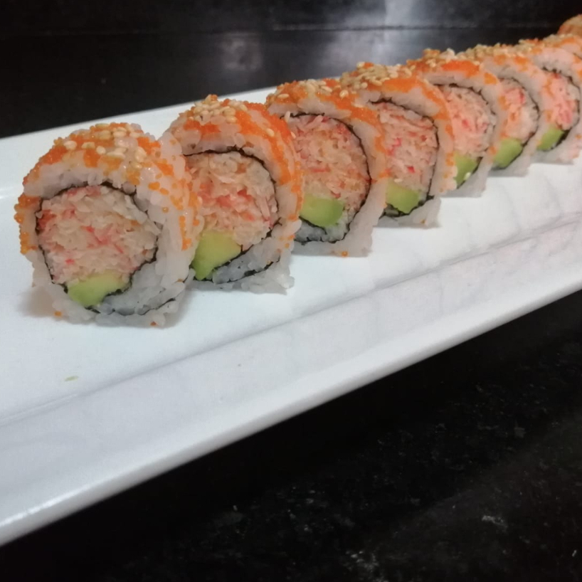 Kanikama, aguacate y pepino topping de ajonjolí y salsa dinamita.