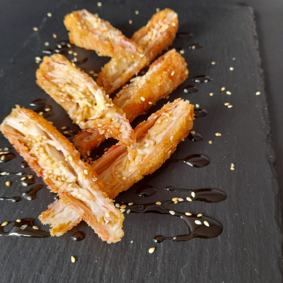 Kanikama crunch rellenos de queso crema y salsa de anguila.