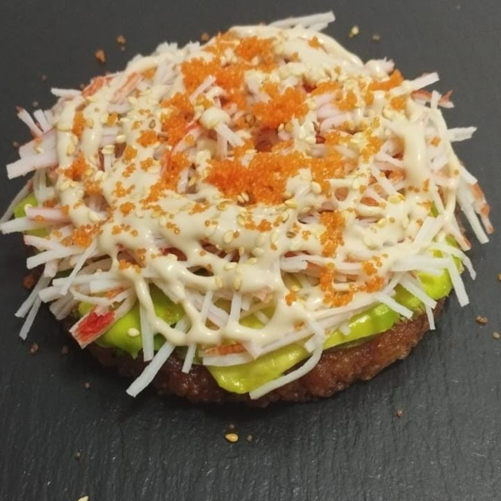 SUSHI Pizza de salmón más SUSHI pizza de cangrejo.