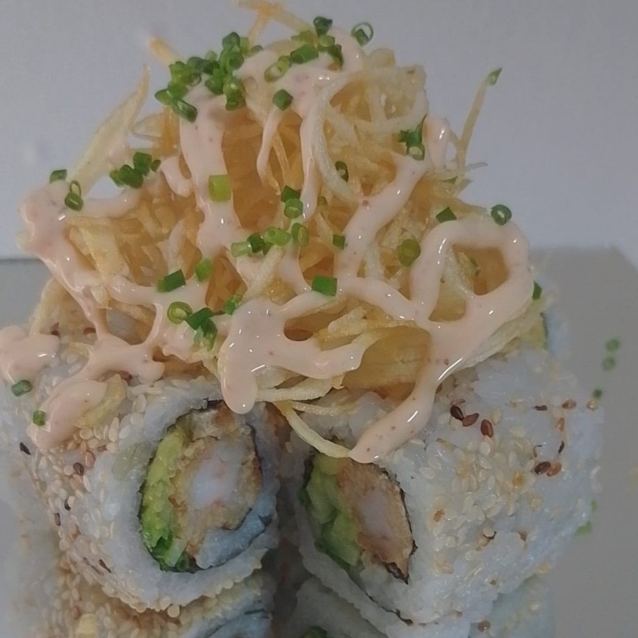 Contiene langostinos apanados, queso crema, aguacate, pepino cubierto de ajonjolí con topping de hilos de papas bañados en salsa spicy.
