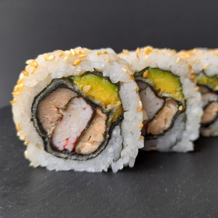 Salmón, atún, kanikama y aguacate, cubierto de ajonjolí.