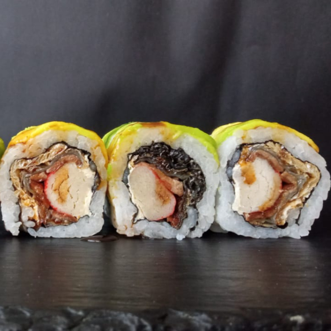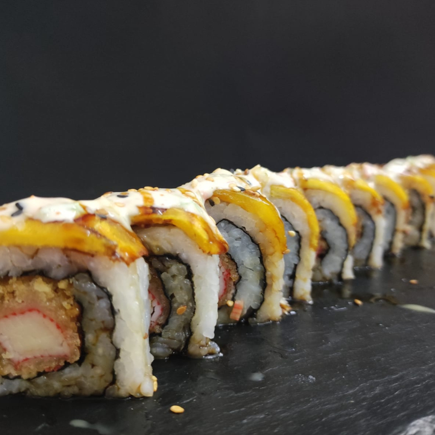 Contiene kanikama, queso crema, aguacate, cebollín cubierto con ensalada dinamita bañado en salsa de anguila.