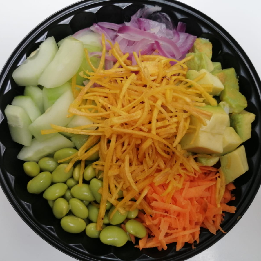 base de arroz de sushi ,zanahoria ,edamames ,aguacate ,hilos de papas y peino