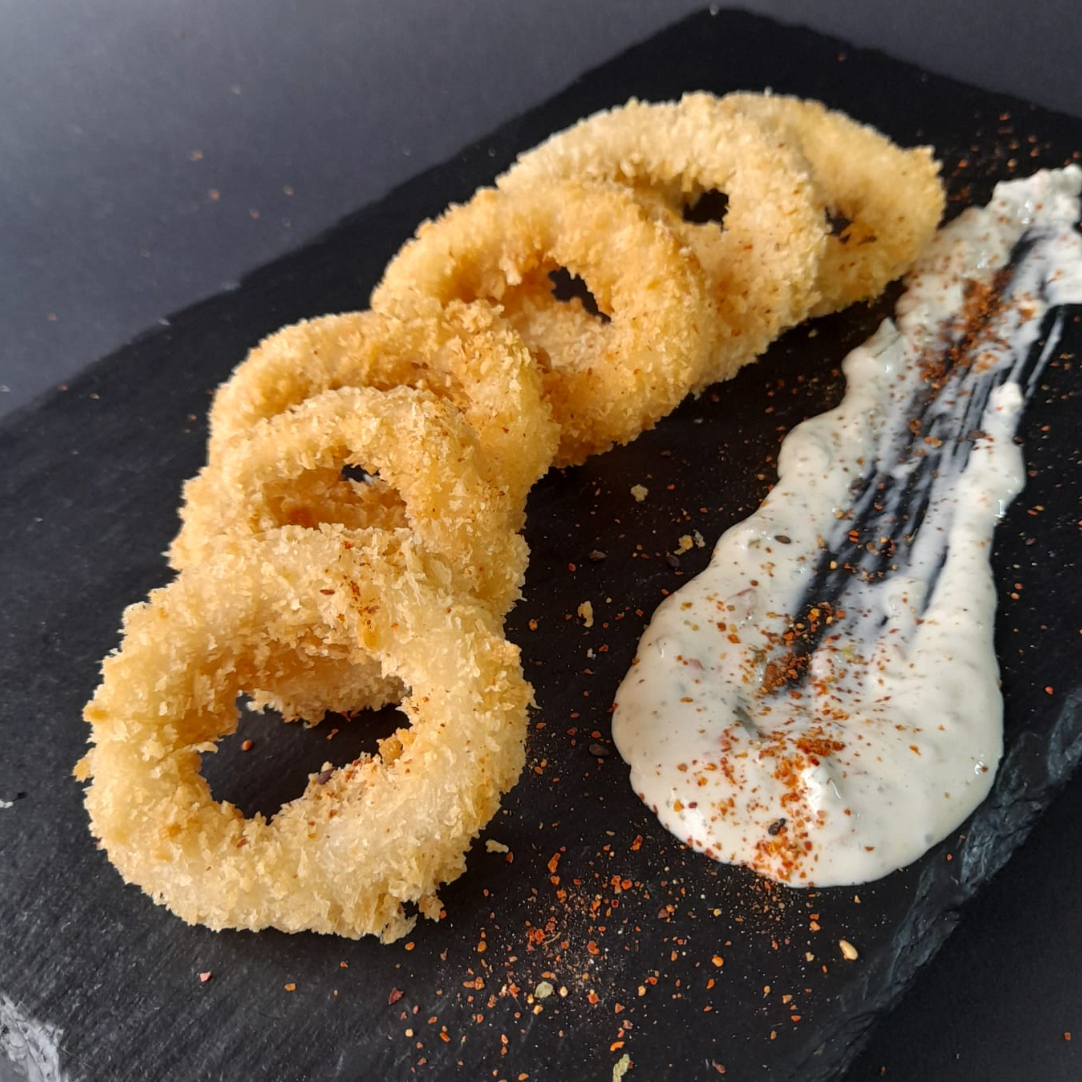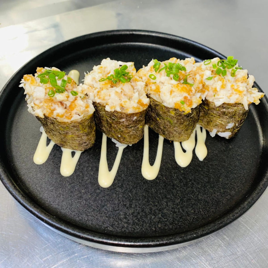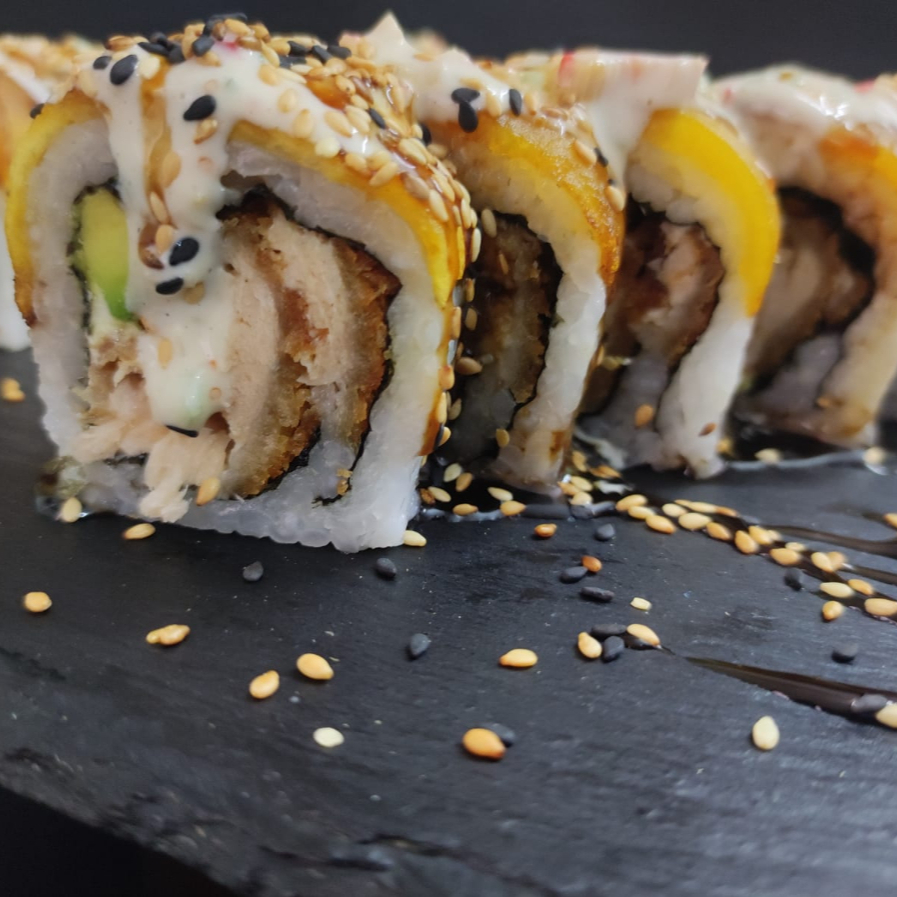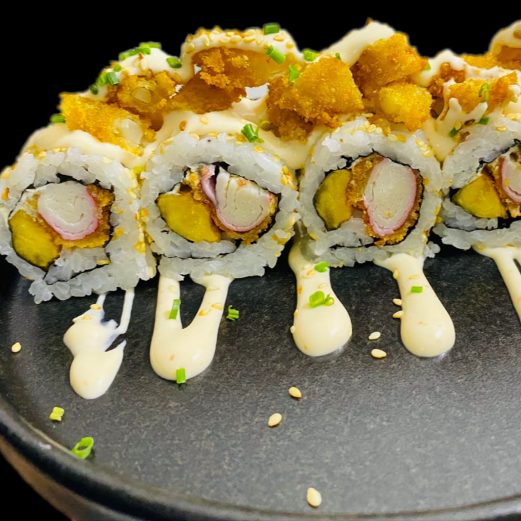 Rolls de calamares tempura, salsa kani y platano maduro bañado en salsa dinamita.