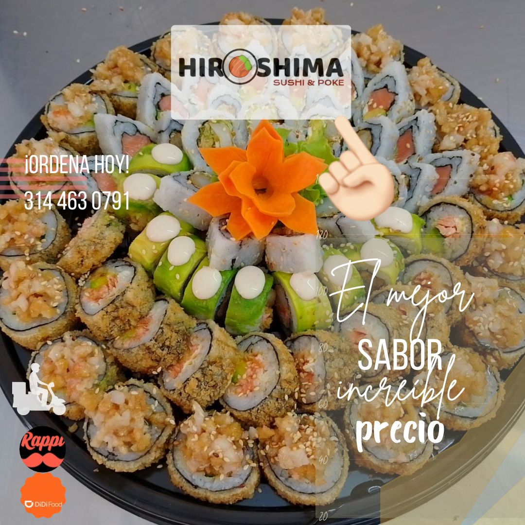 10 criollo Rolls, 10 Colombia rolls, 10 hiroshima rolls, 10 platano rolls, 10 grado 33 rolls, 10 filadelfia tempura más bebida litro Postobón.