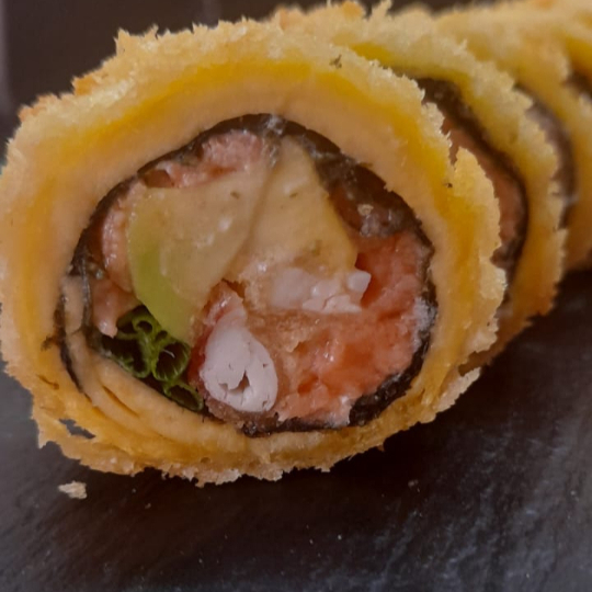 Borrito apanado con cebolla crocante, salmón tempura, queso crema, aguacate, plátano y salsa spicy.