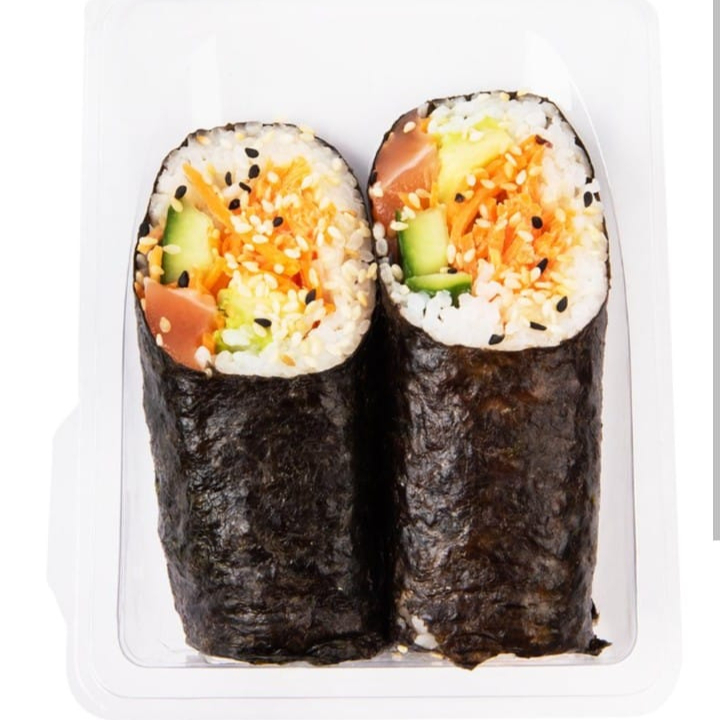 Envuelto en plátano maduro, salmón, kanikama,queso crema, aguacate, cebollín y tempura sin arroz.