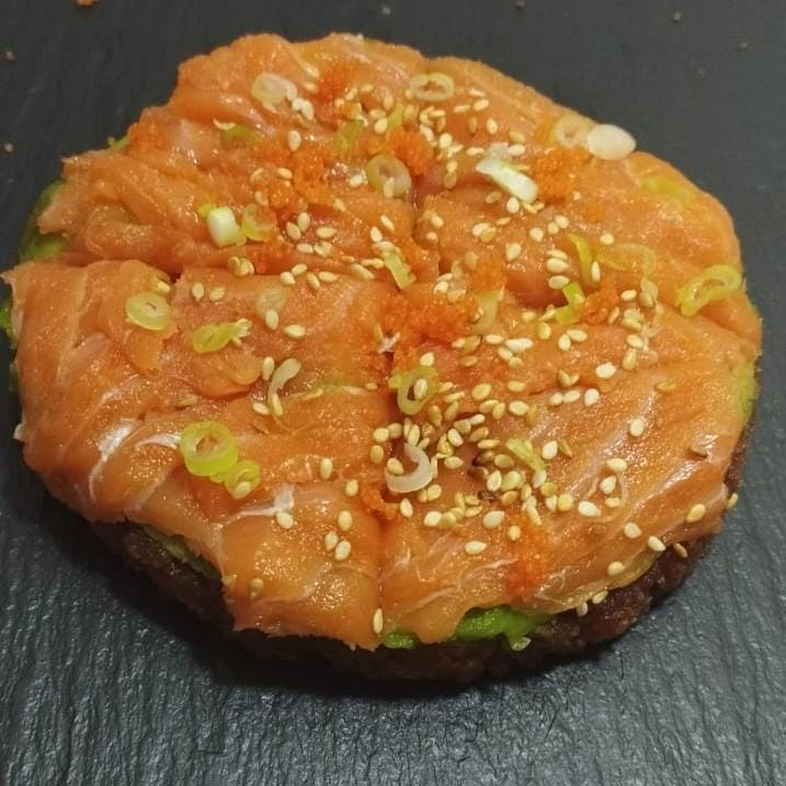 base de arroz frito ,tartar de salmon con mayones japonesa y cebollin y aguacate
