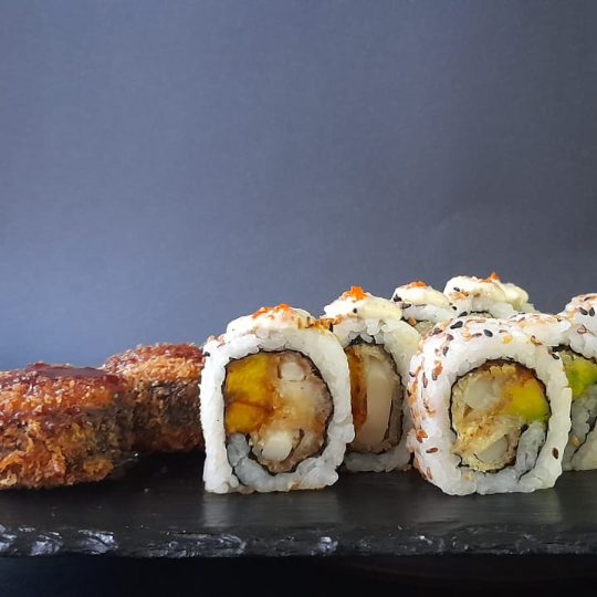 Sushi con queso crema, plátano maduro, kanikama apanado, rollo tempura, salsa de anguila más una bebida gratis.