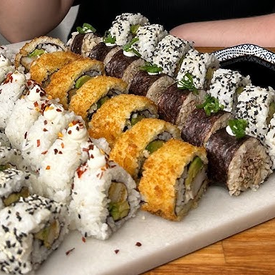 Combo familiar de 50 piezas con 10 california (kanikama, pepino y aguacate cubierto con masago y ajonjolí), 10 Fuji Roll (kanikama, vegetales tempura, queso crema con topping de langostinos bañado en salsa fuji y salsa de anguila), 10 salmón skin (piel de salmón crocante, kanikama y queso crema cubierto de aguacate y salsa de anguila), 10 rollos de Spicy Kani (queso crema, aguacate) y tokio.