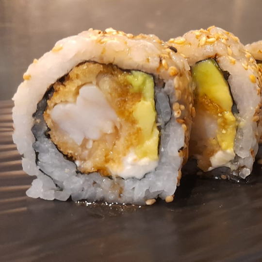 Langostinos tempura, queso crema y aguacate cubierto de ajonjolí.