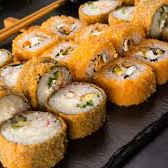 piezas de sushi con kanikama, queso crema y maduro rollo tempura salsa teriyaki.----