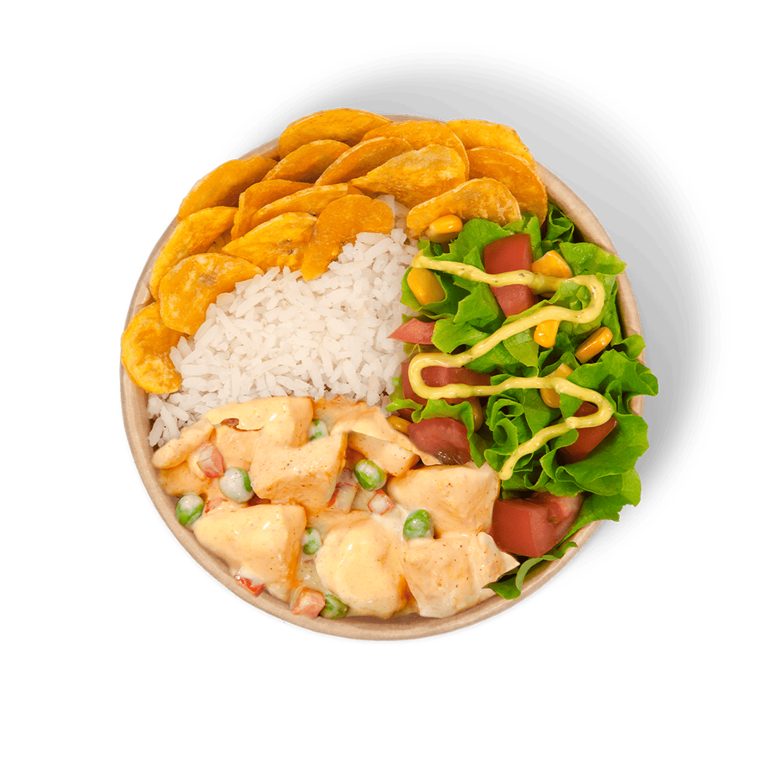 1 bowl con cerdo en salsa agridulce, ensalada con lechuga, tomate, maíz salteado, arroz blanco, moneditas de plátano y salsa de la casa. Elige la bebida de tu combo.