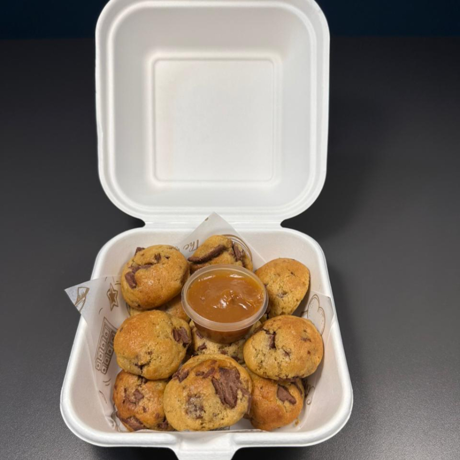 10 mini galletas estilo NY de chispas de chcolate con el mas delicioso sabor para compartir con familia y amigos. esta cajita incluye una delicosa porción de salsa para que acompañes cada bocado con una gran combinación.