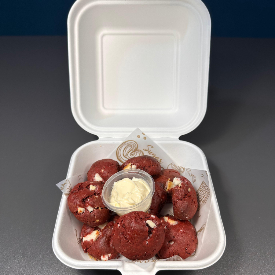 10 deliciosas mini galletas estilo NY de red velvet y chocolate blanco, ideales para compartir con amigos y familia. esta cajita viene con una deliciosa salsa a elección para que hagas una gran combinación.