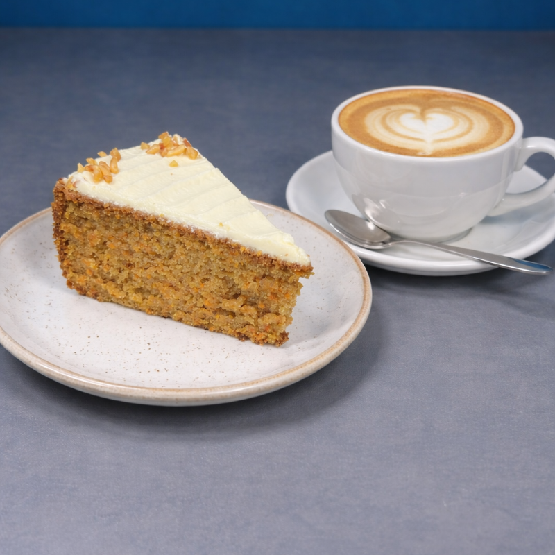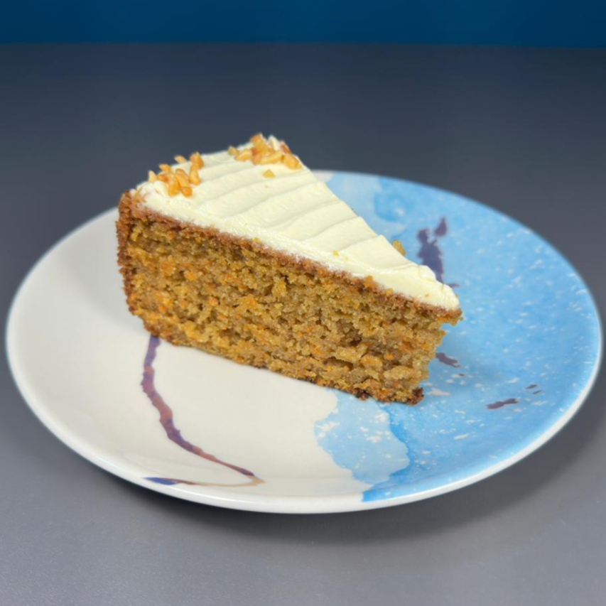 Deliciosa porción de torta de zanahoria con todo el sabor casero, acompañada de un delicioso fosting de queso crema que equilibra perfectamente los sabores en cada bocado.
