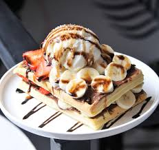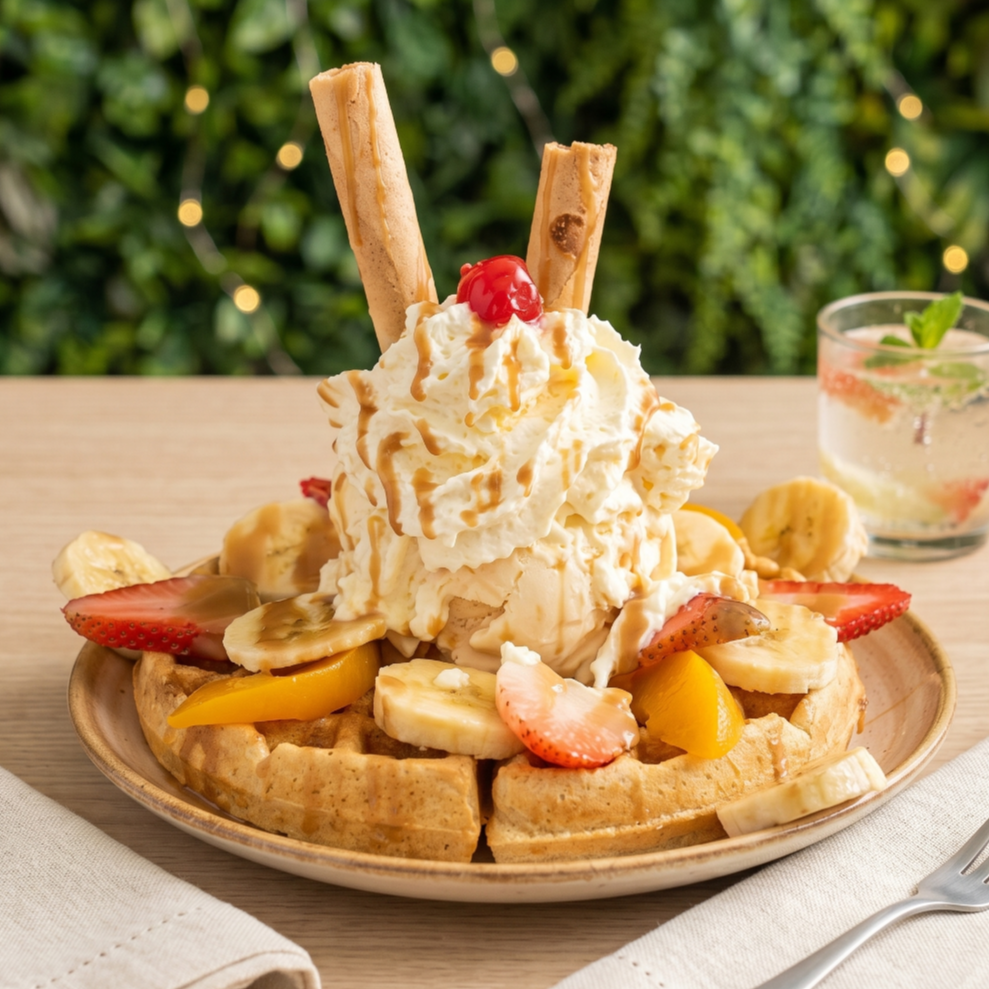 Waffle básico con 1 bola de helado, durazno, fresa, banano, chantilly, barquillos y 1 cereza.