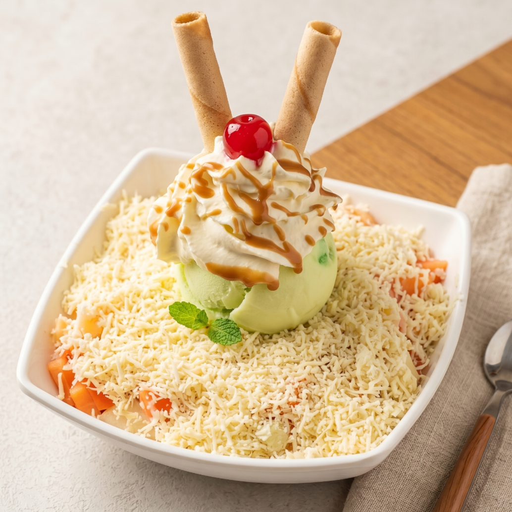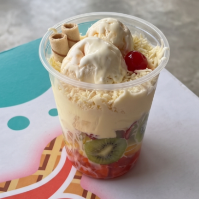 Combinación de papaya, banano, manzana verde y roja, fresa, queso, gelatina, 1 bola de helado, barquillos, crema de la casa y 1 cereza.