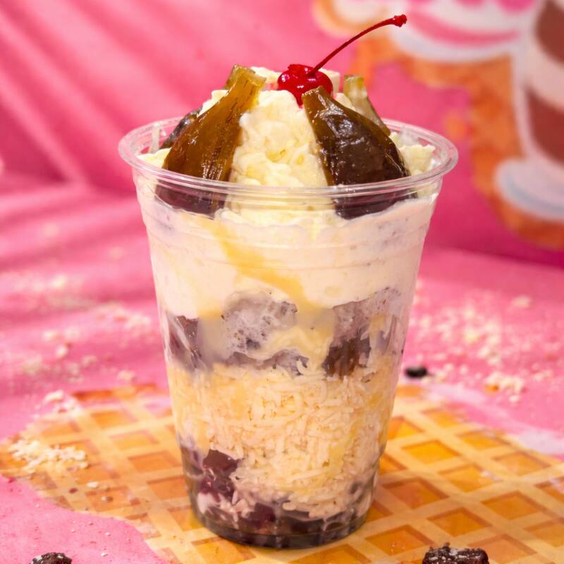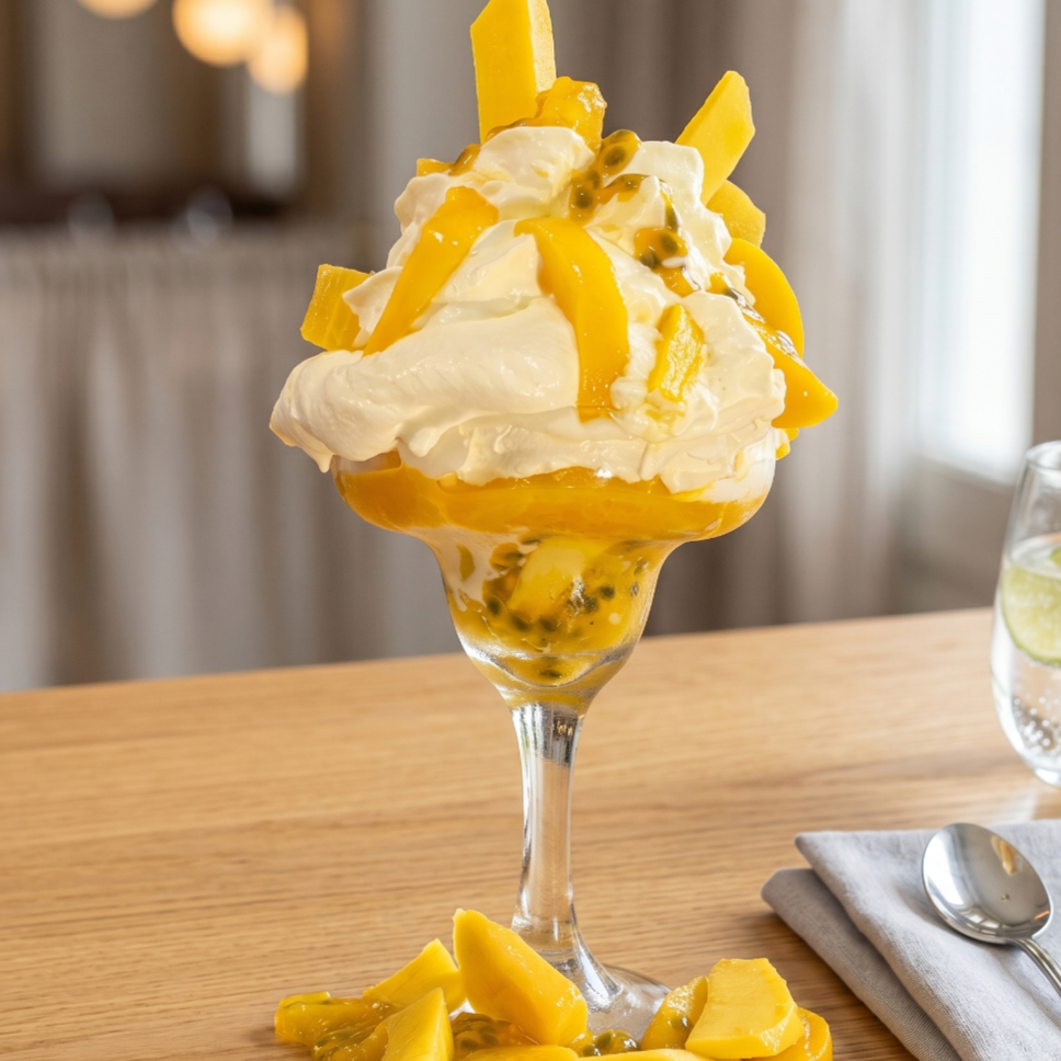 Refrescante copa con mango, piña, durazno, maracuyá, 2 bolas de helado, chantilly, barquillos piazza y chips de chocolate.