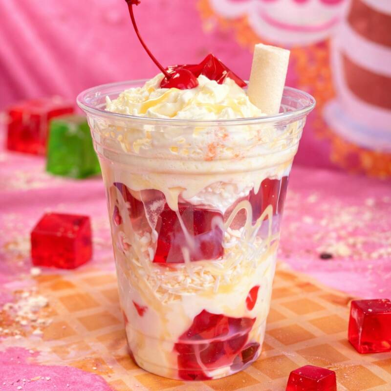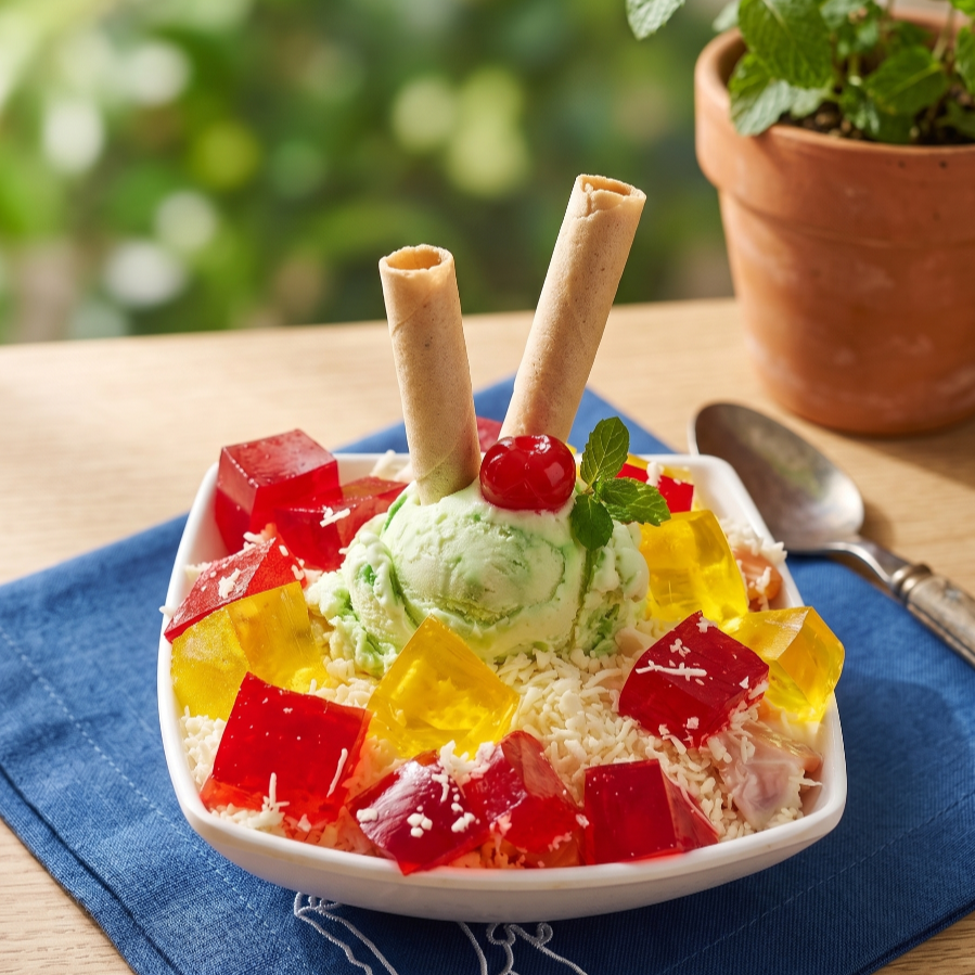 Postre de gelatina con 2 bolas de helado, gelatina, chantilly y barquillos.
