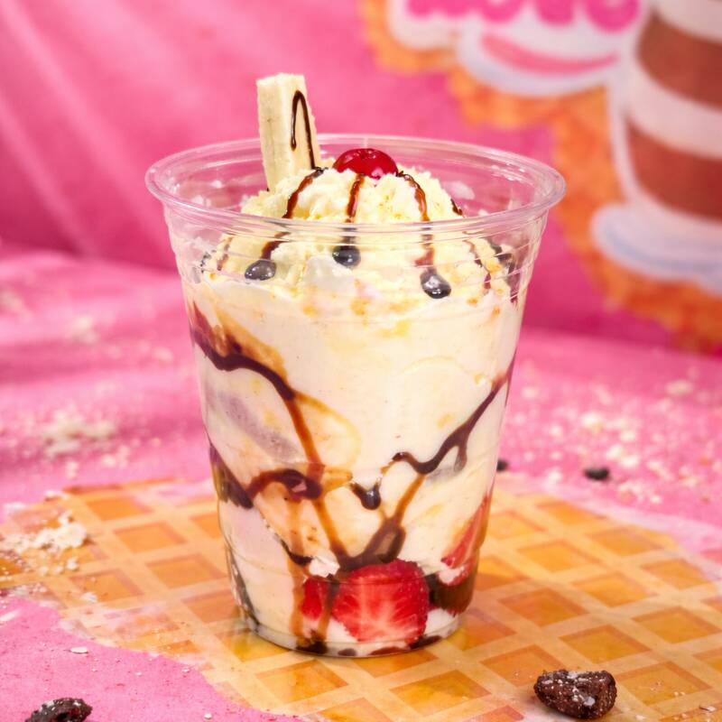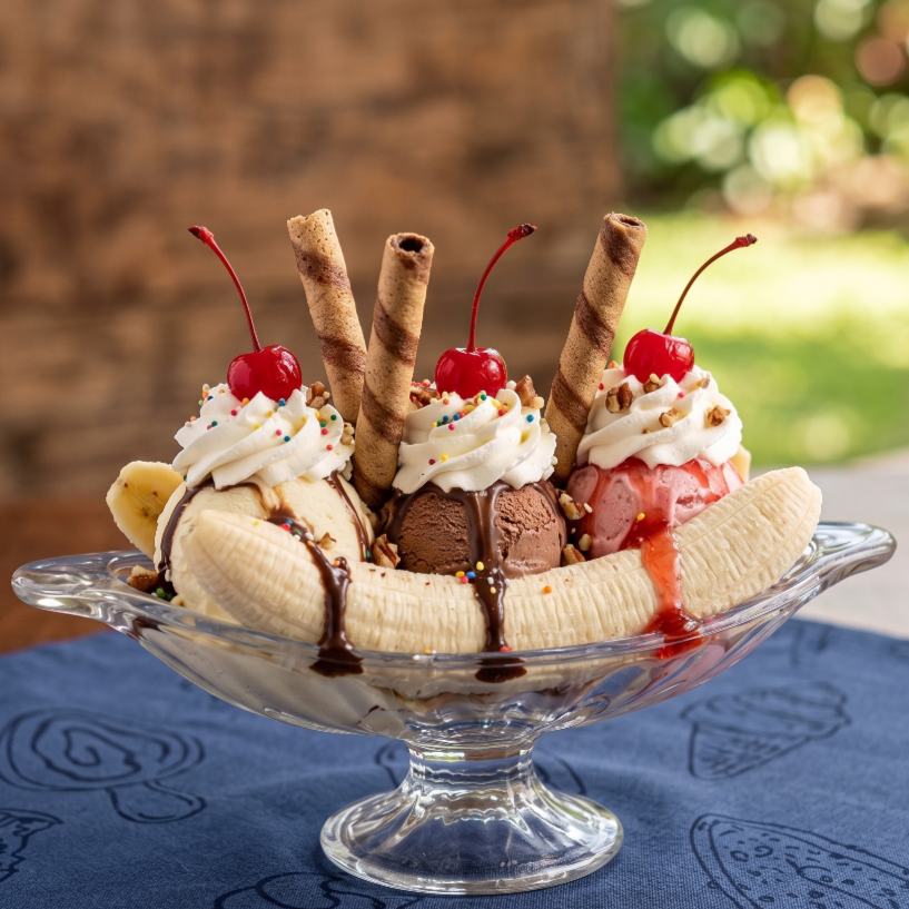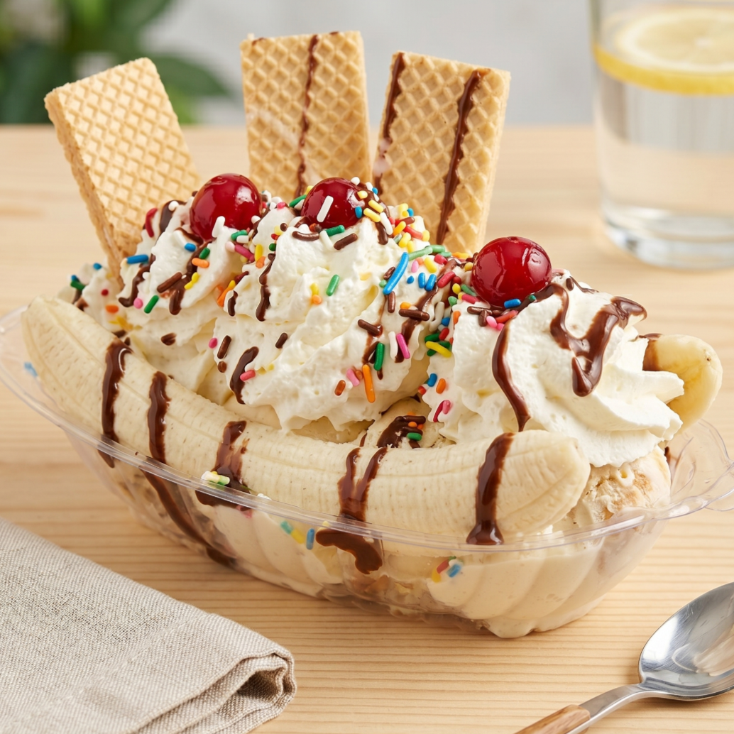 Banano con 3 bolas de helado, queso, chantilly, galleta wafer, cereza, banano, chips de colores y chocolate.