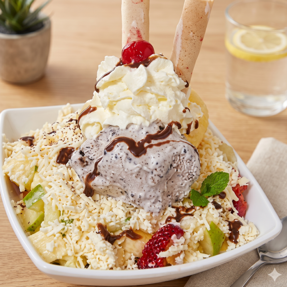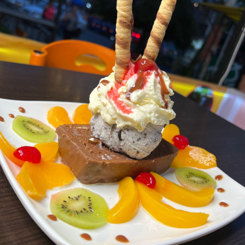 Papaya, banano, manzana verde y roja, kiwi, durazno, piña, mango, queso, 2 bolas de helado, chantilly, barquillos y 1 cereza.