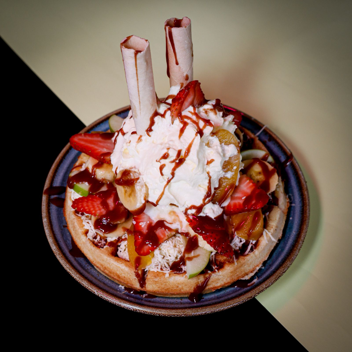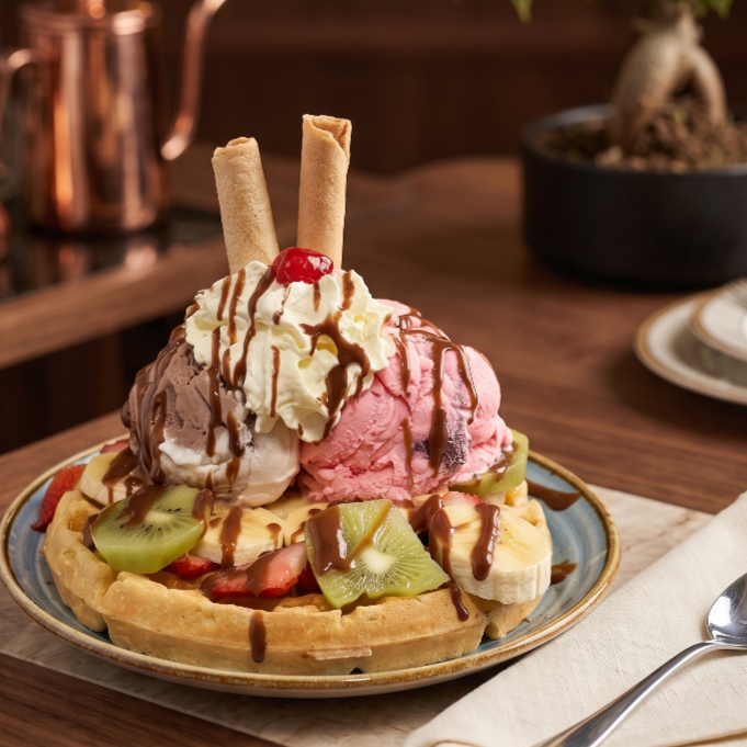 Waffle premium con kiwi, fresa, banano, 2 bolas de helado, barquillos, chantilly, 1 cereza y salsa de chocolate.