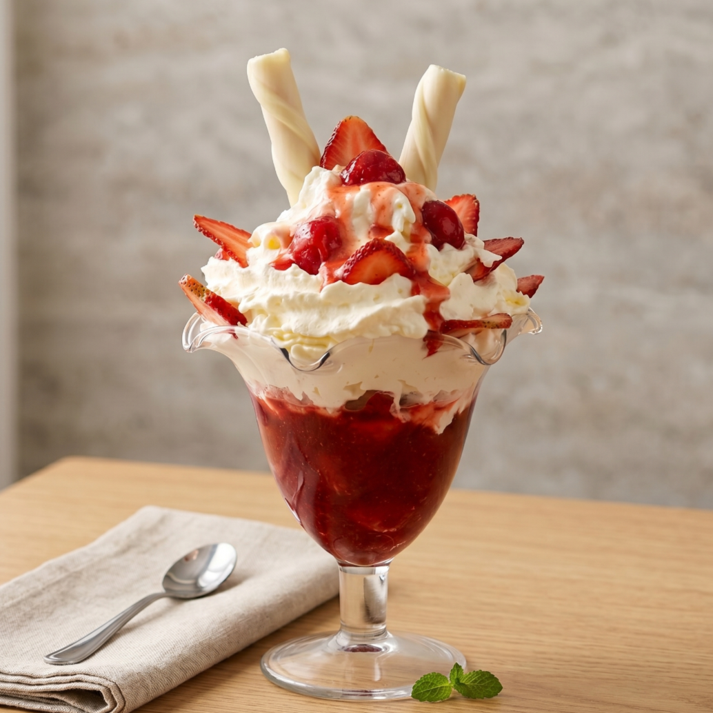 Copa con 3 bolas de helado, chantilly, fresa, barquillos y 1 cereza.