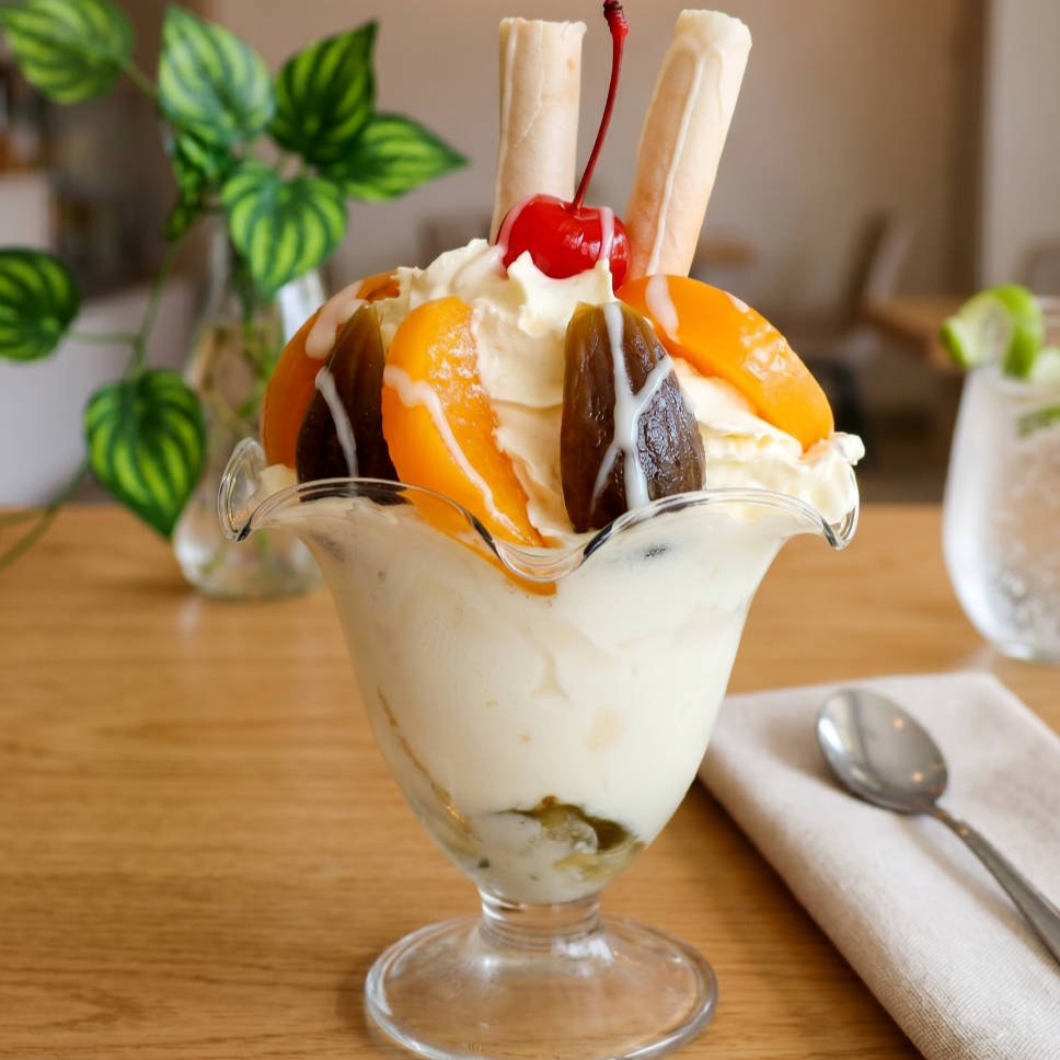 Combinación de durazno, brevas, 2 bolas de helado, chantilly, barquillos y 1 cereza.